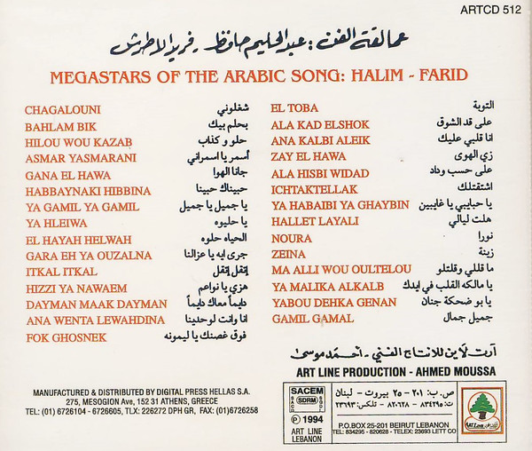 This is a 27′ one Track album, with a remix of the listed songs From Abdel Halim Hafez & Farid El Atrach.