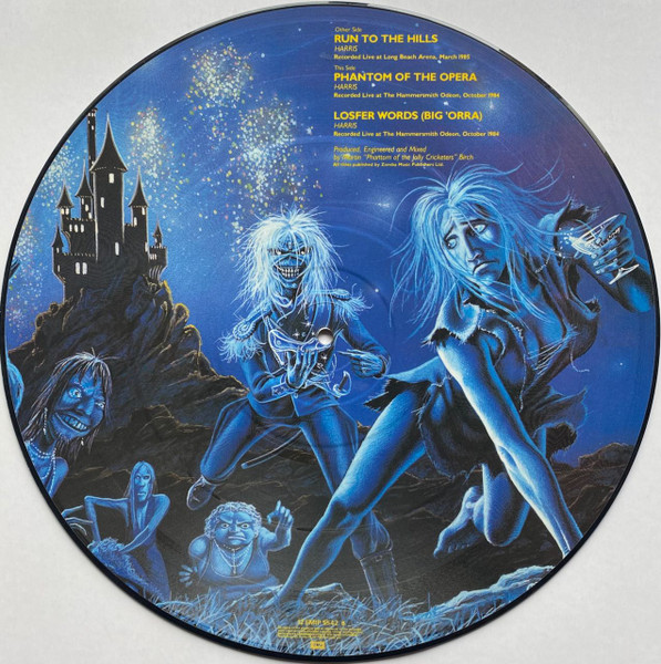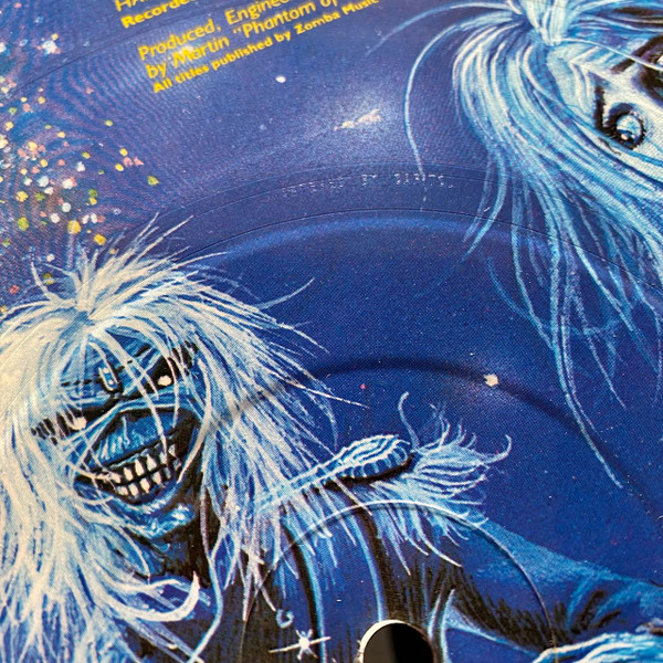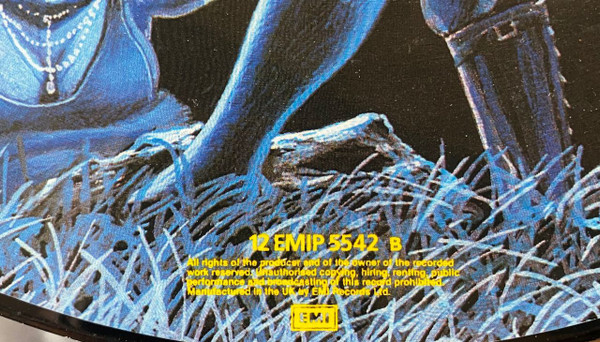 The painter, Derek Riggs, is strangely not credited beyond his symbol/signature on A side illustration.